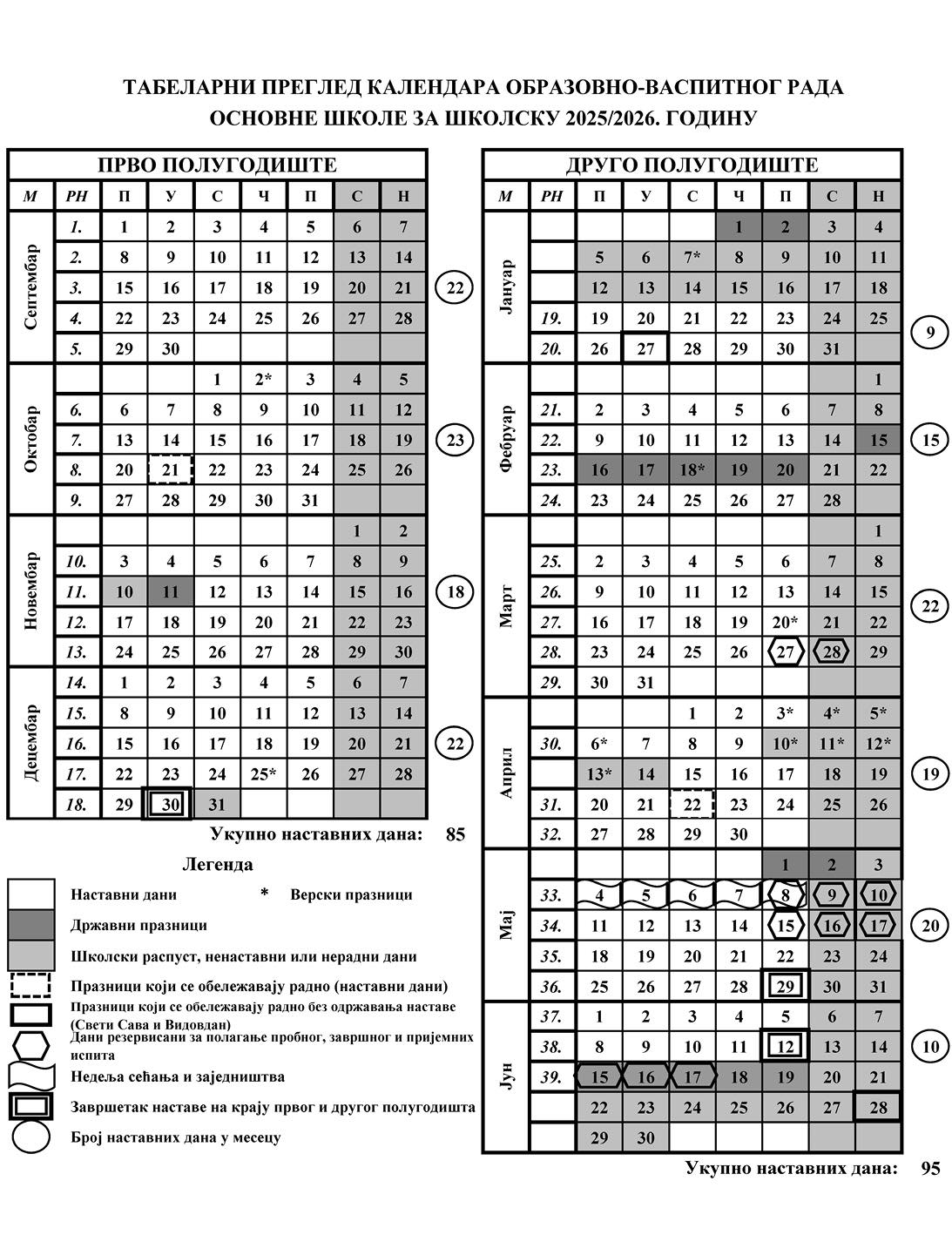 Календар рада основних школа 2025/26. година.